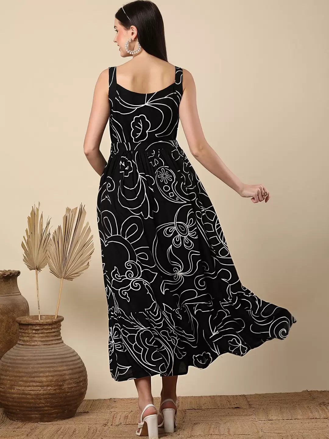 Women Abstract Printed Pleated Shoulder Straps A-Line Maxi Dress